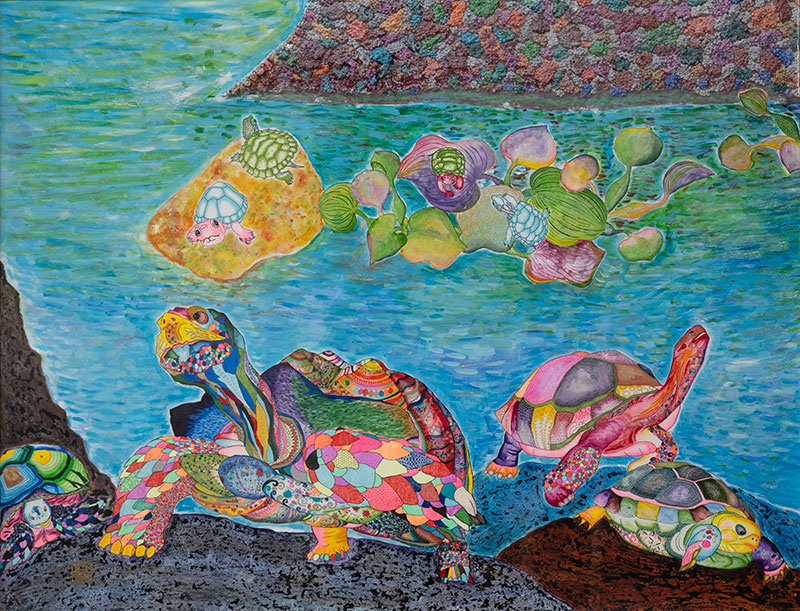 自分の目で見たもの、感じたものを、独特のオリジナリティで様々な想いの世界観を創り上げ描いている。独自の色彩感覚にてカラフルに描かれた作品には、自分や家族との生活、たくさんの人との関わりから生まれてくるメッセージが入っています。数多くの賞を受賞。