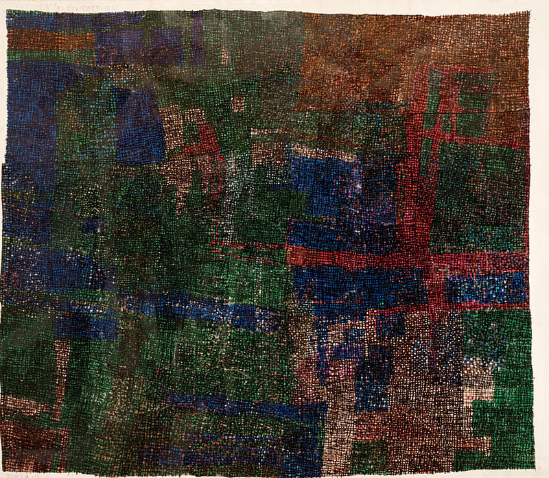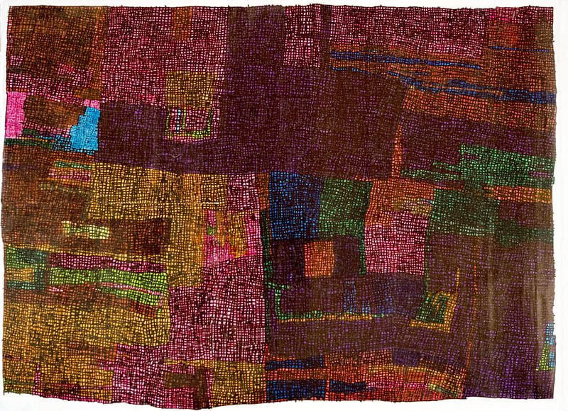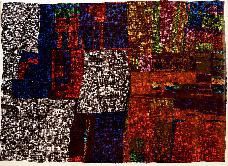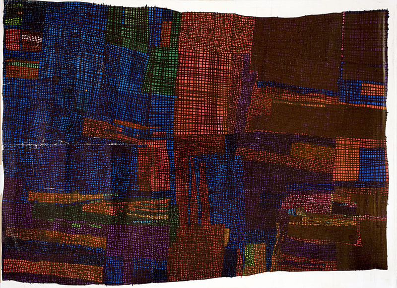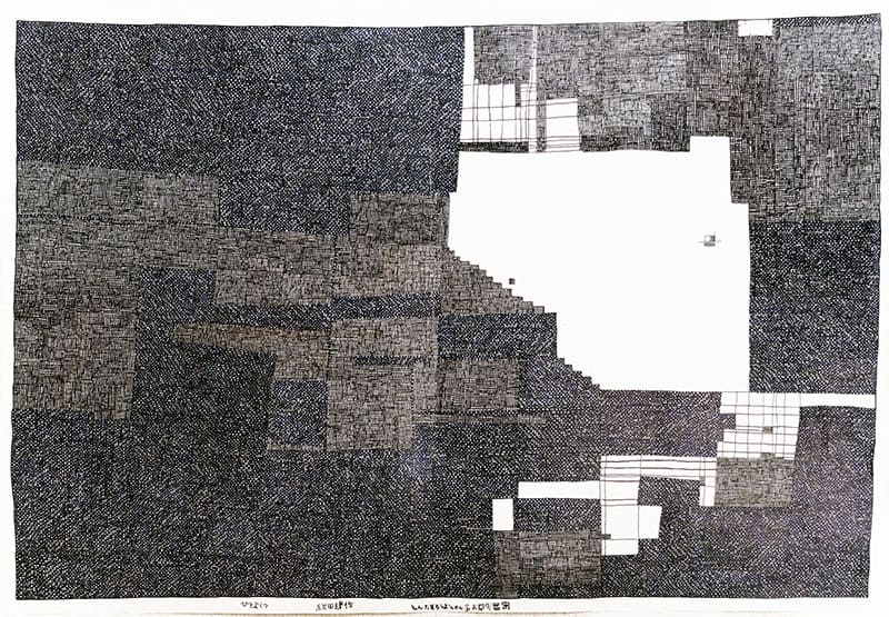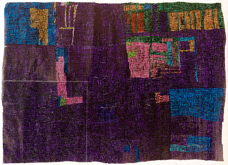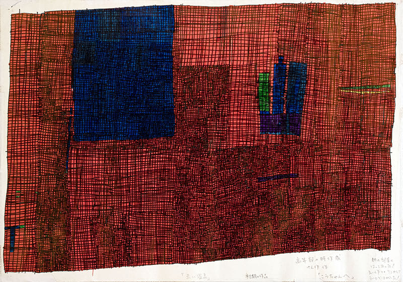 小学校高学年の頃、身近な人の頭足人を描きその顔の中に格子を入れる。中学生になると大判カレンダーの裏に格子のみを油性ペン「マッキー」で描く。格子の目は大きく、先天性白内障のため見みえにくかったのだと思われる。19歳の両目手術後に、細かい格子の表現になる。大判カレンダー裏紙のしっかりとした紙質・特性を好み、力強い線で格子模様を描いている。